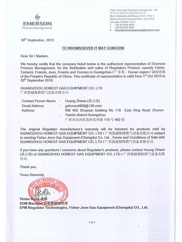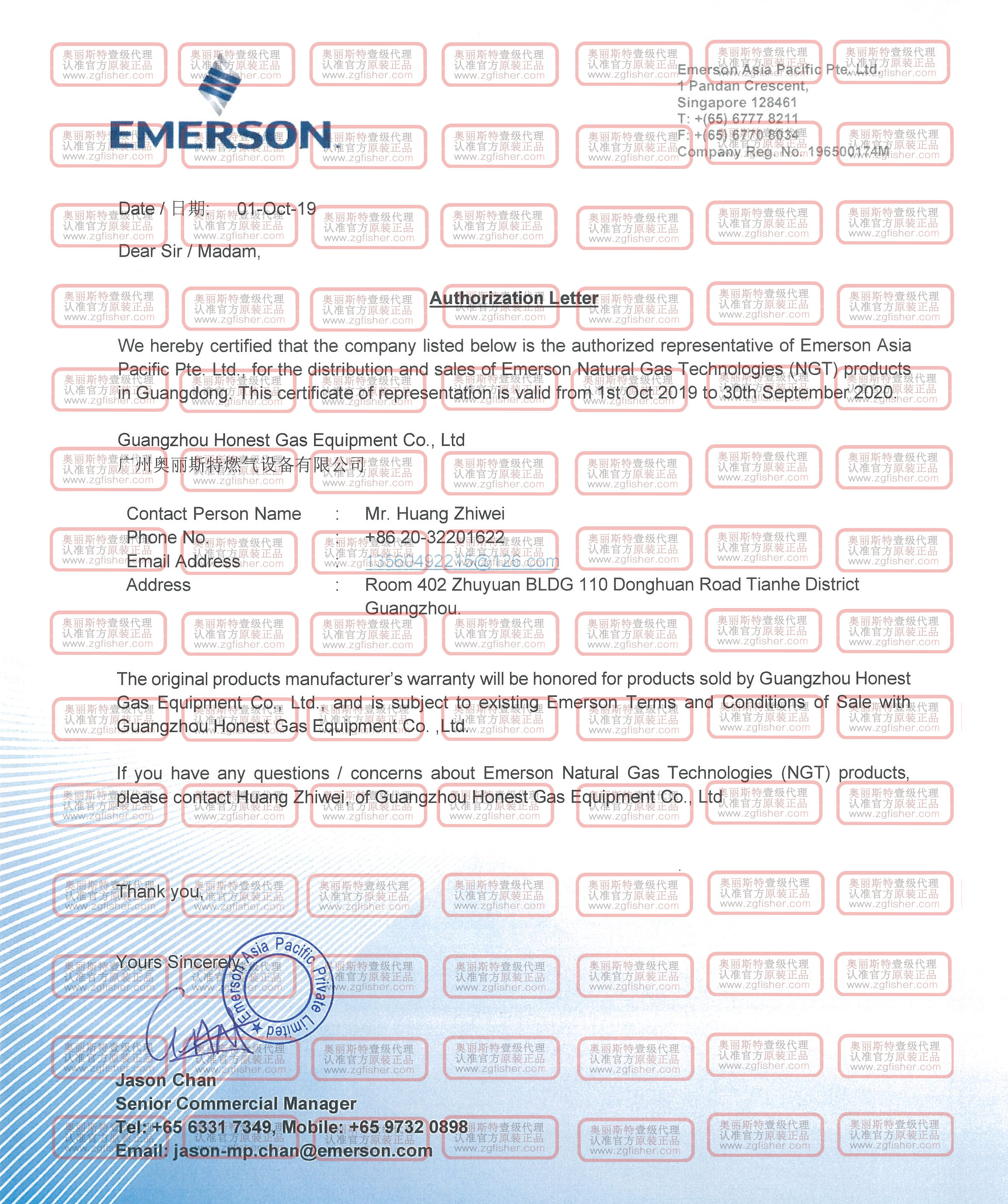 2020年度代理證書EMERSON艾默生/FISHER費希爾